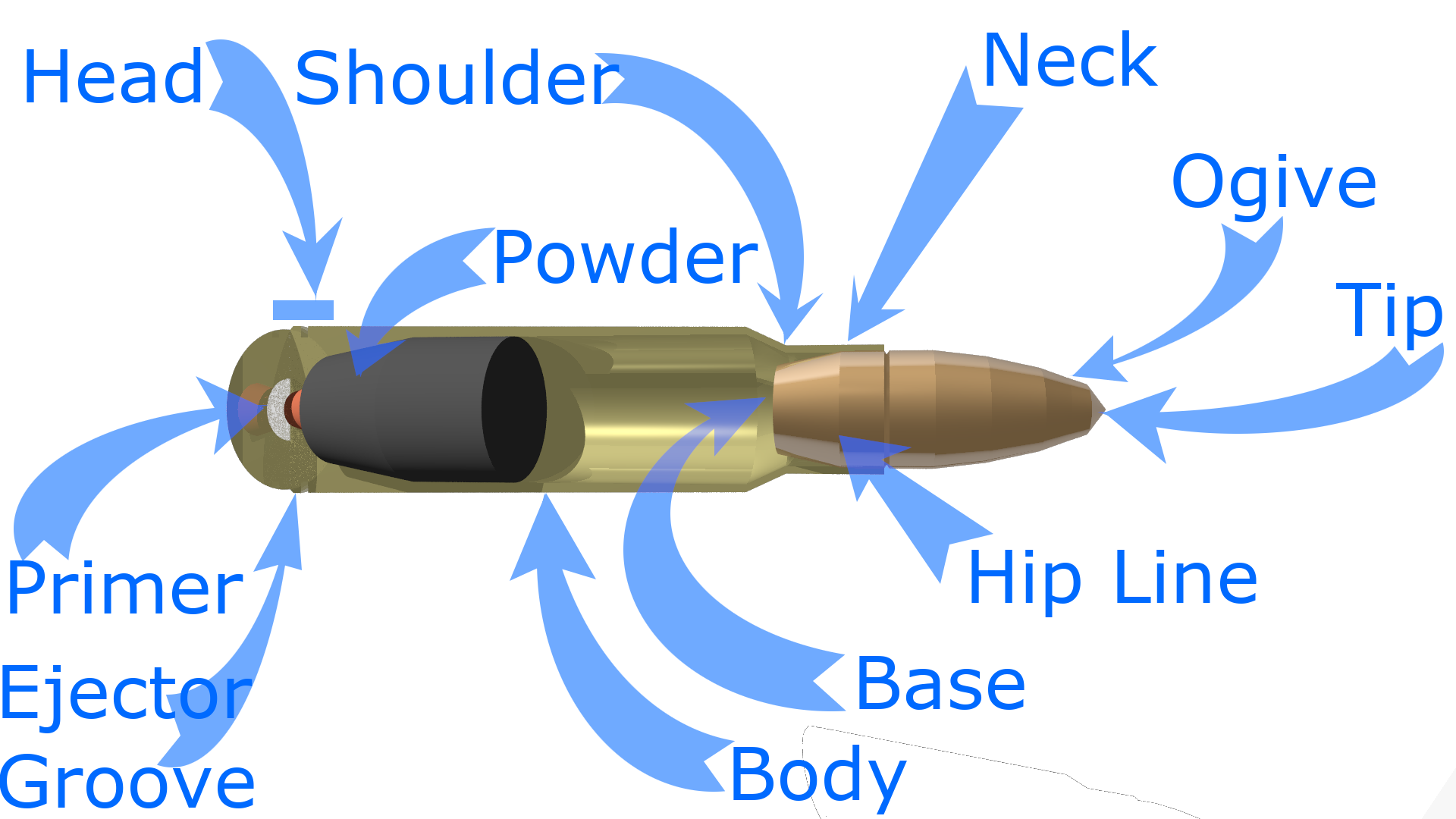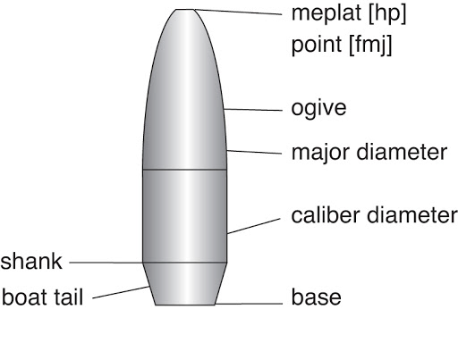 The tip of the bullet is usually called a “point” (you know, like missiles, the pointy-end goes up). You’ve heard the term “hollow point” – this is just a case in which the point is omitted to increase the expansion of the projectile on impact, and in this case the official term is "meplat", but point or tip is still perfectly valid. The ogive is the leading, curved surface of the bullet. Ogive is actually a French term coined to describe the pointed curve of a gothic arch in architecture (it’s the leading definition, actually). Consequently, it is used to describe the pointed, curved arc of a bullet as well, even if there is no point on the bullet (e.g. a .30-30 lever action cartridge). The caliber diameter should be to specifications, and should match the barrels bore (with clearance). The shank of the bullet is also called a “hip”. In the above diagram is a term called the boat tail – and not all bullets have a boat tail. If the caliber diameter goes directly to the base, the boat tail is omitted.
