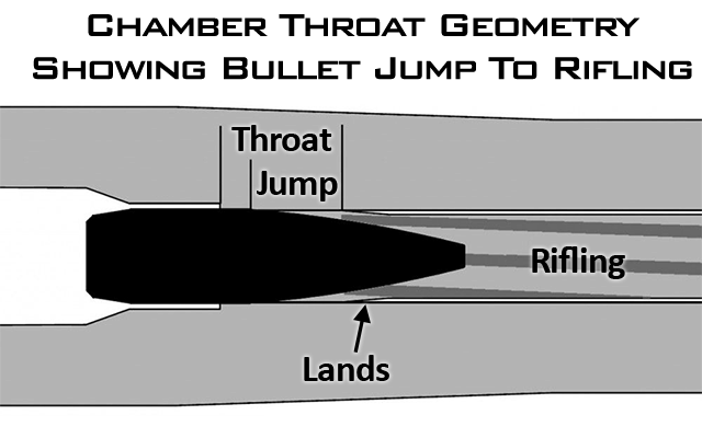 The throat is the area of the chamber extending from where the shell/casing ends to where the rifling/bore is at the diameter of the remainder of the bore. This includes everything from the freebore, jump, and lands.