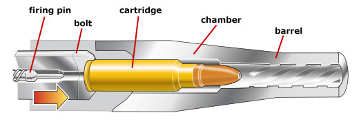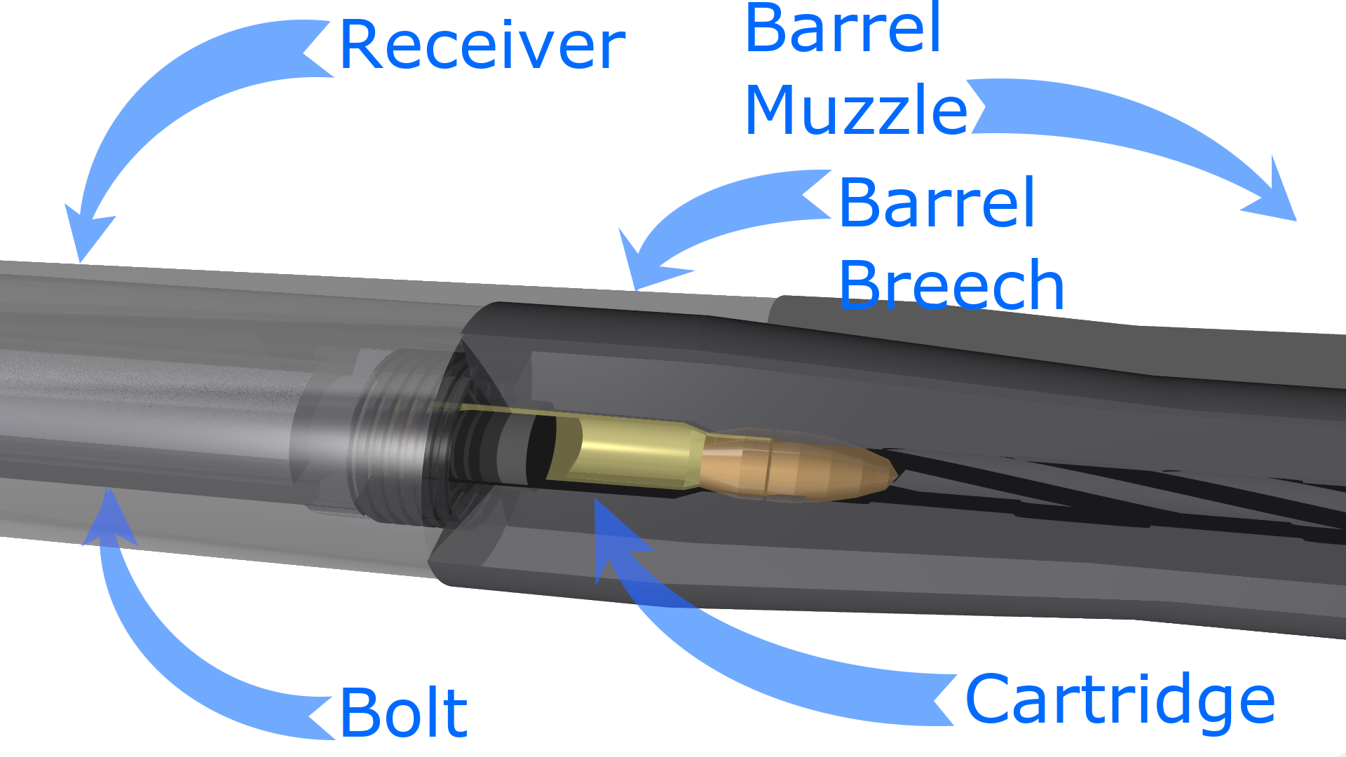 In the following chart, the "bolt" is part of the firing group, the receiver and cartridge are marked, and the barrel is broken down into "breech" and "muzzle". The breech is the end the bullet is inserted, and the muzzle is the exit end.