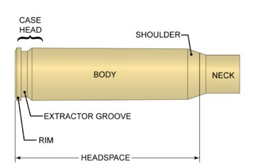 The casing in a rifle typically has a neck and a shoulder added. The shoulder is the secion of the casing where it drops in diameter to something that can hold onto the bullet, and the neck is the area of the case that actually binds to the bullet. When a case does not have a lip with which to grasp the bullet that is larger than the case wall, an ejector groove has to be used. This is used to extract a fired (or spent) casing from the chamber in preparation to have another one added. See below for some of these case-specific definitions.