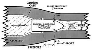 In figure 1, we see the lands placed as the ramp from the throat to the rifling. The distance between the ogive of the bullet start (where it meets the caliber diameter) to where the ramp starts is called the “jump”. In figure 2, we see the land is just part of the rifling, there is no “jump”, and the ramp is called the “bullet free-travel”. The throat is called the “freebore”, but does not include the ramp to the rifling. In figure 3, we see the land as part of the bore, but the ramp is now called the “jump”. The throat now includes the ramp. So, let’s get some things clear.