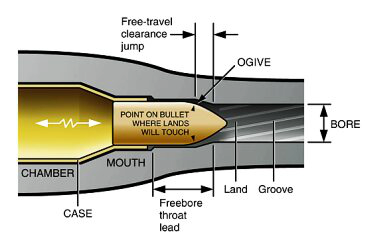 The jump is the distance where the bullet starts the curve from full caliber diameter to the point (start of the ogive) to where the ramps begin to form leading to the rifling. It is called the freebore as it has no rifling (it will be a slightly larger diameter than the bore itself). The term “jump” comes from the fact that the bullet has to jump from it’s position into the chamber. As the freebore is a larger diameter than the rifling, it means the bullet has the potential to jump around until it enters the bore/rifling.