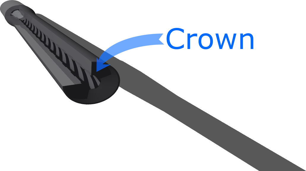 As noted previously, the barrel is essentially a long tube or pipe. Also noted earlier, the "chamber" is the cavity in the breech end of the barrel that accepts a loaded cartridge. When the cartridge is loaded, it is either ready-to-be-fired, or has already been fired. The loading of a cartridge into the chamber is often called "chambering" a round. The other end of the barrel is called the "muzzle". When you hear of a "crown", this is the muzzle end, and is a bevel on the inside in an attempt to protect the barrel, and also to try and keep redirecting the expanding gases from the explosion pushing on the back of the bullet as it leaves.The two ends are called the "breech" and the "muzzle". The muzzle end includes a "crown", e.g. :